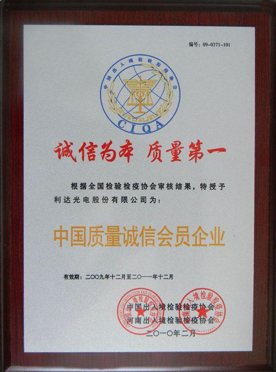 利達光電股份有限公司榮獲首批“中國質量誠信會員企業(yè)”榮譽稱號