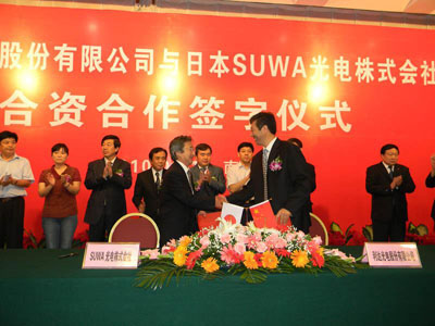 ??????? 上午8:30簽字儀式正式開始。公司領(lǐng)導(dǎo)代表公司與SUWA光電竹內(nèi)清社長簽定了合資合作協(xié)議,與會領(lǐng)導(dǎo)走上主席臺共同見證了這一歷史時刻并舉杯慶賀。
