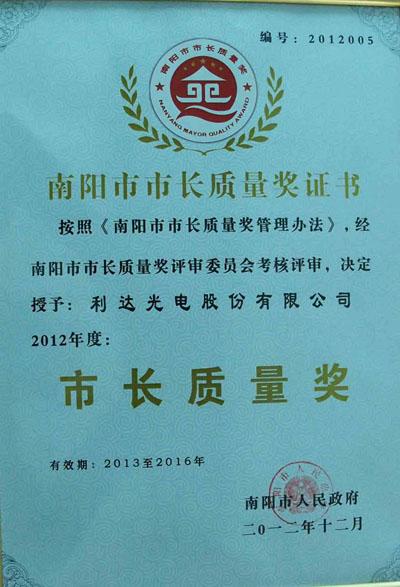 利達(dá)光電榮獲2012年度南陽(yáng)市“市長(zhǎng)質(zhì)量獎(jiǎng)”