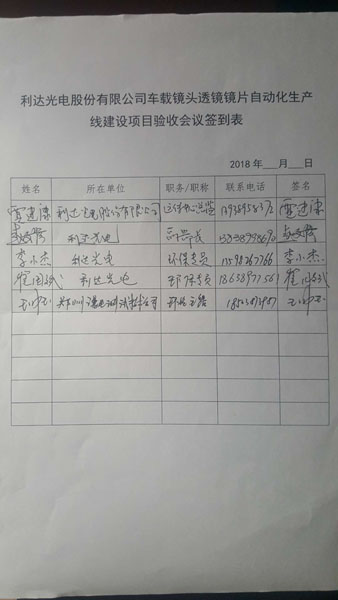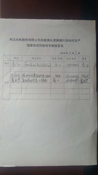 ???? 2018 年 6 月 5 日,利達(dá)光電股份有限公司根據(jù)利達(dá)光電股份有限公司車載鏡頭透鏡鏡片自動(dòng)化生產(chǎn)線建設(shè)項(xiàng)目竣工環(huán)境保護(hù)驗(yàn)收監(jiān)測(cè)報(bào)告,并按照《建設(shè)項(xiàng)目竣工環(huán)境保護(hù)驗(yàn)收暫行辦法》,嚴(yán)格按照國(guó)家有關(guān)法律法規(guī)、建設(shè)項(xiàng)目竣工環(huán)境保護(hù)驗(yàn)收技術(shù)規(guī)范/指南、本項(xiàng)目環(huán)境影響評(píng)價(jià)報(bào)告表和審批部門審批意見(jiàn)等要求,主持召開了該公司車載鏡頭透鏡鏡片自動(dòng)化生產(chǎn)線建設(shè)項(xiàng)目環(huán)境保護(hù)竣工驗(yàn)收會(huì)議。參加驗(yàn)收會(huì)議的有項(xiàng)目建設(shè)單位(利達(dá)光電股份有限公司)、環(huán)評(píng)單位(南陽(yáng)市環(huán)境保護(hù)科學(xué)研究所有限公司)、驗(yàn)收監(jiān)測(cè)報(bào)告編制單位(鄭州譜尼測(cè)試技術(shù)有限公司)的領(lǐng)導(dǎo)、代表及邀請(qǐng)的專家共計(jì) 6 人,會(huì)議成立了項(xiàng)目竣工環(huán)境保護(hù)驗(yàn)收組(名單附后),負(fù)責(zé)項(xiàng)目的驗(yàn)收工作。