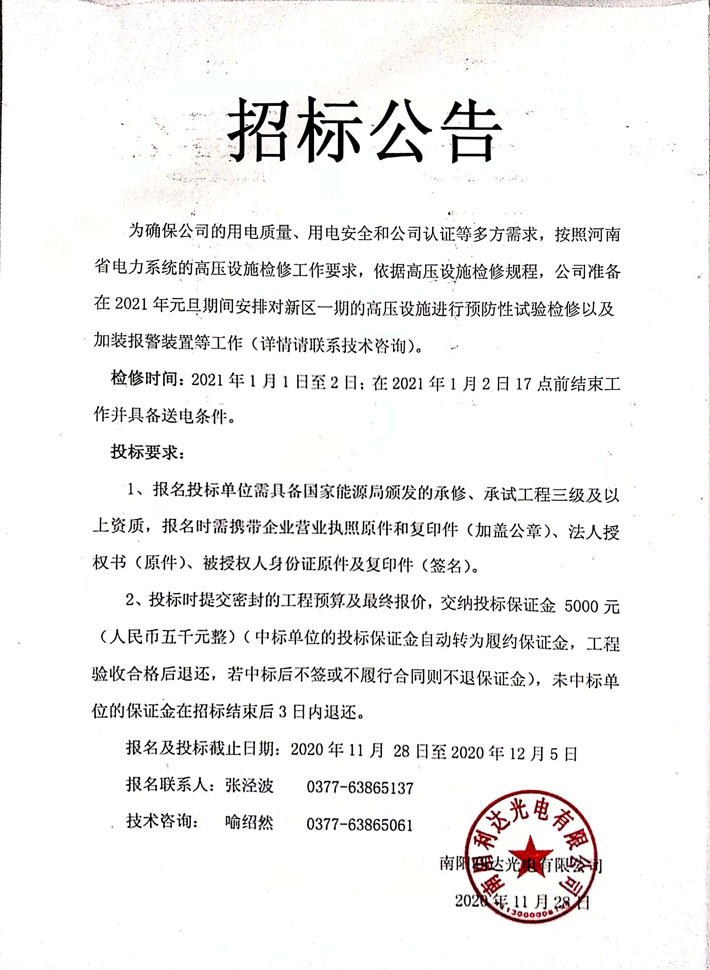 新廠區(qū)高壓配電設備預防性試驗招標公告