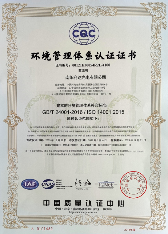 環(huán)境管理體系認(rèn)證證書(中文)