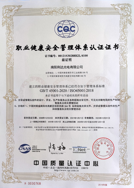 職業(yè)健康安全管理體系認(rèn)證證書(中文)